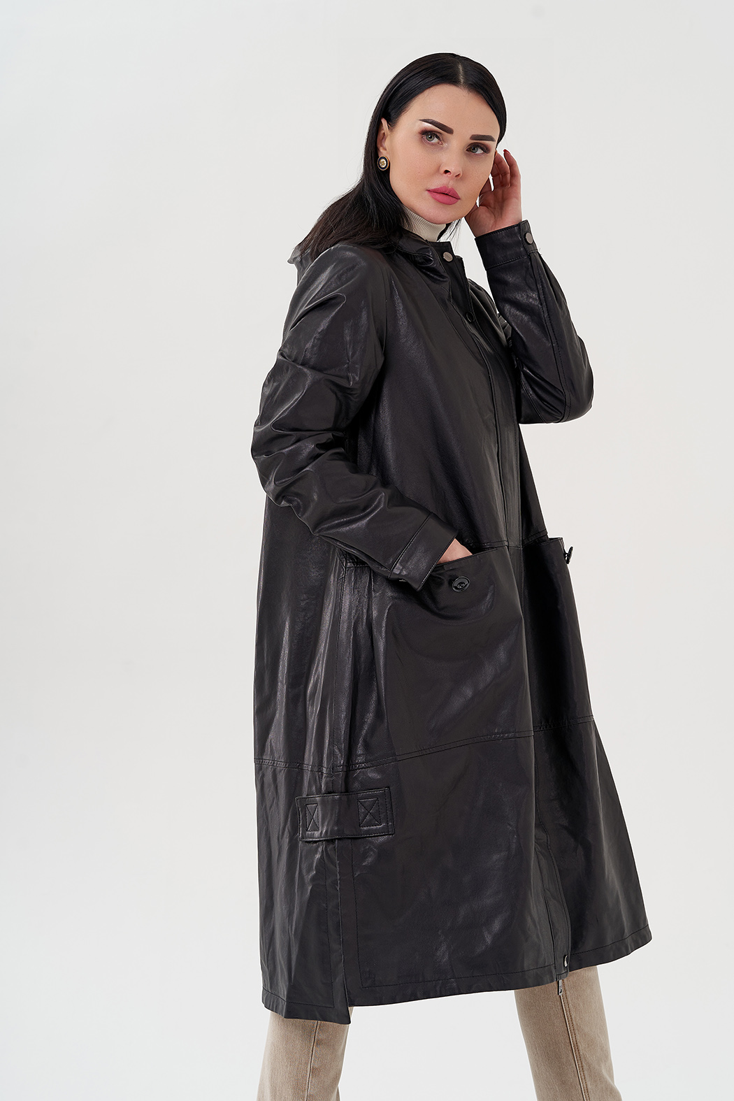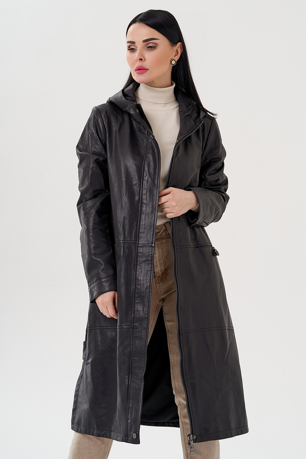 Длинный кожаный плащ с капюшоном