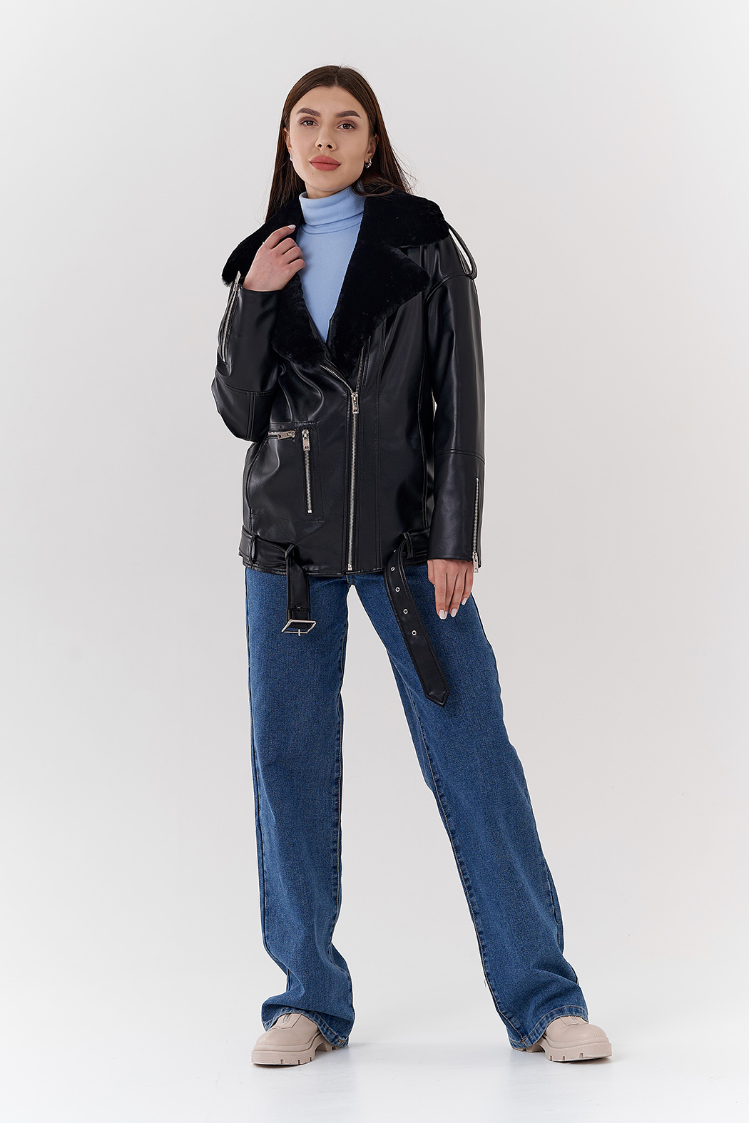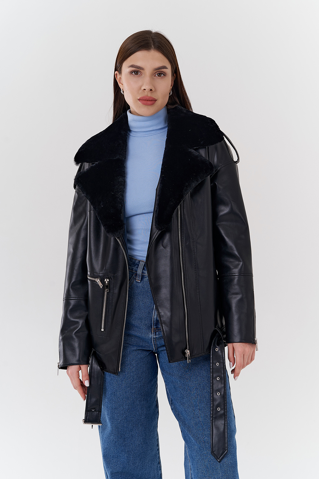 Удлиненная куртка из эко кожи с воротником из эко меха